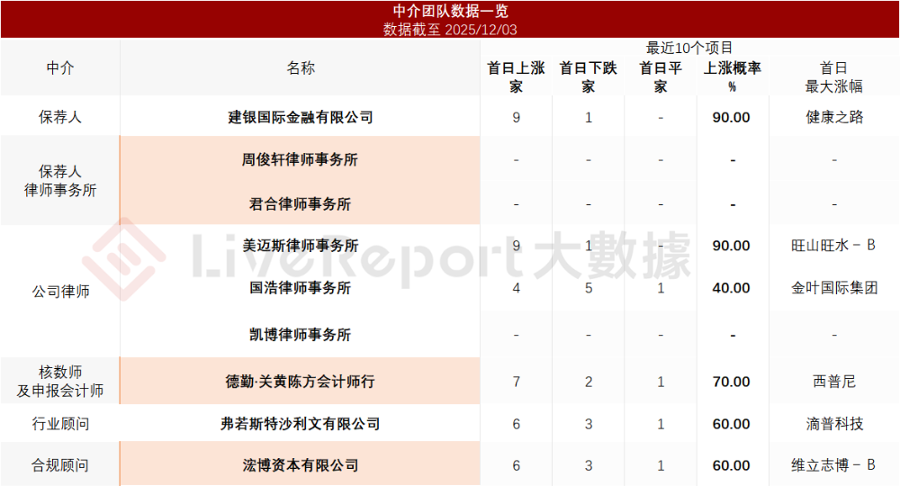 据LiveReport大数据统计,倍通数智中介团队共计9家,其中保荐人1家,近10家保荐项目数据表现值得肯定;公司律师共计3家,综合项目数据表现中规中矩。整体而言中介团队历史数据表现普通。
