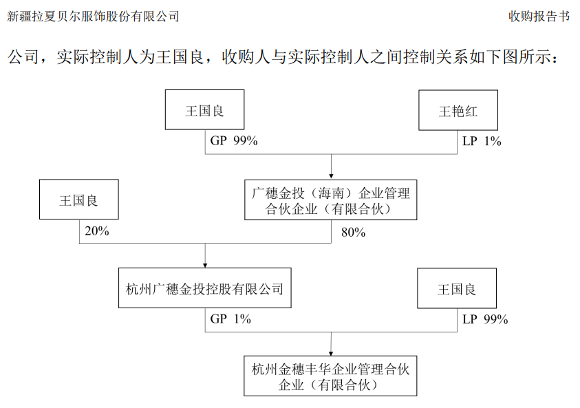 公开资料关于王国良的信息并不多。据悉,其于1984 年出生,中国国籍,无境外永久居留权,现任杭州广穗金投控股有限公司执行董事兼总经理。从天眼查信息来看,其所任职的企业中也曾包括服装类企业。此外,其本人控制的企业包括四家,其中杭州广穗电子商务有限公司主营业务包括互联网服装服饰零售,与拉夏贝尔和一定的同业竞争。