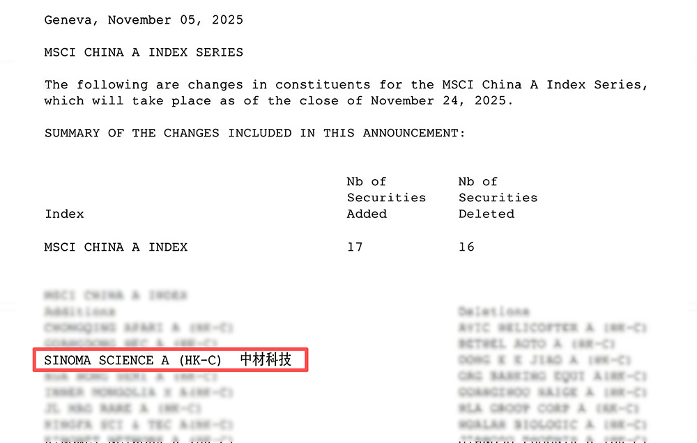 近日,国际指数编制公司MSCI最新公布的11月指数审核变更结果正式生效,中材科技股份有限公司(简称“中材科技”)被纳入MSCI中国指数,标志着公司的投资价值与发展潜力获得全球资本市场的认可,也为公司未来发展注入强劲动力。