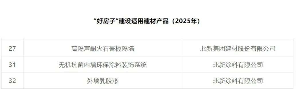 近日,住房和城乡建设部科技与产业化发展中心正式公示“好房子”建设适用建材产品(2025年)首批名单,经严格审查,北新建材高隔声耐火石膏板隔墙、北新涂料无机抗菌内墙环保涂料装饰系统、北新涂料卓彩外墙涂料系统3款产品成功入选,成为“好房子”建设的优选建材伙伴。