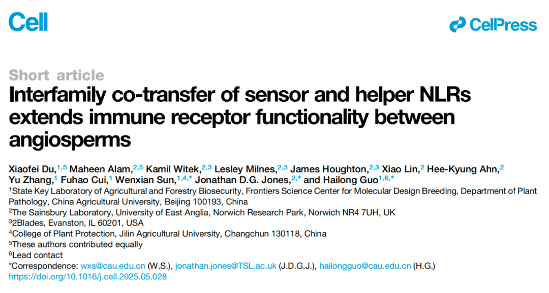 近日,吉林农业大学副校长、植物保护学科孙文献教授以通讯作者身份,在国际顶级学术期刊《Cell》上发表了一篇题为《Interfamily co-transfer of sensor and helper NLRs extends immune receptor functionality between angiosperms》的研究成果,这是吉林农业大学首次以通讯作者单位在Cell期刊上发表科研论文。该研究首次系统性地展示了通过共同转移感受型和辅助型NLR免疫受体,可以克服NLR免疫受体“受限的分类学功能”瓶颈,实现在分类学上差异较大的植物间重建免疫信号通路。这项发现不仅为作物病害的绿色防控提供了新策略,也为未来多物种间的分子设计育种提供了理论基础和实践指导。