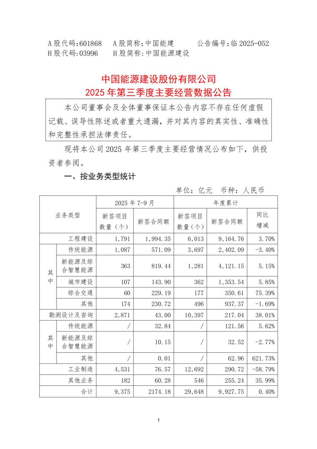 10月25日,中国能源建设股份有限公司发布2025 年第三季度主要经营数据公告,公告显示:2025年前三季度新签合同额9927.75亿元,同比增长0.4%。其中,工程建设类合同额9164.76亿元(同比增3.7%),勘测设计及咨询类217.04亿元(增38.01%),工业制造类290.72亿元(降58.79%)。