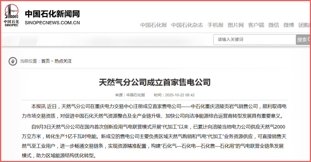 日前,中国石化天然气分公司在重庆电力交易中心注册成立了首家售电公司——中石化重庆涪陵页岩气销售公司,并取得了电力市场交易资质。