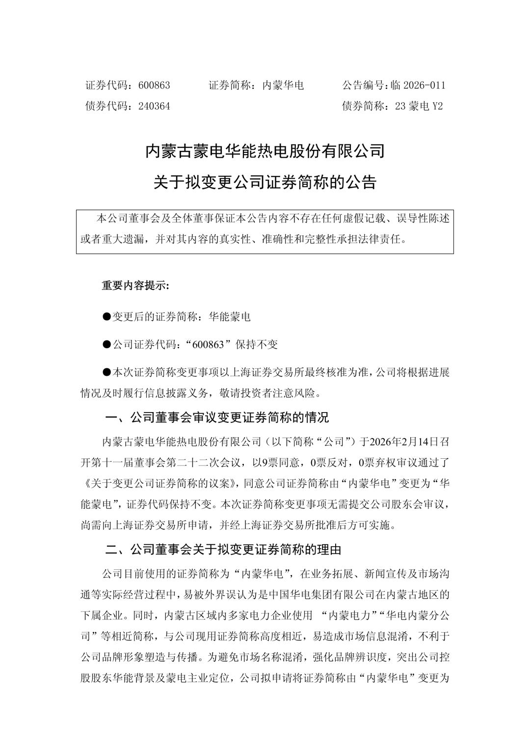 内蒙华电公告称,公司于2026年2月14日召开第十一届董事会第二十二次会议,审议通过了《关于变更公司证券简称的议案》,同意公司证券简称由“内蒙华电”变更为“华能蒙电”,证券代码保持不变。