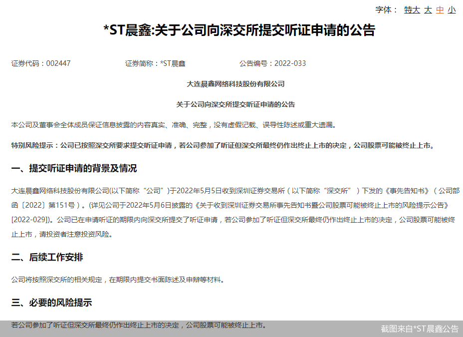 5月11日晚间,*ST晨鑫披露公告显示,公司于5月5日收到深交所下发的拟被终止上市事先告知书,公司已在申请听证的期限内向深交所提交了听证申请,将按照相关规定在期限内提交书面陈述及申辩等材料。