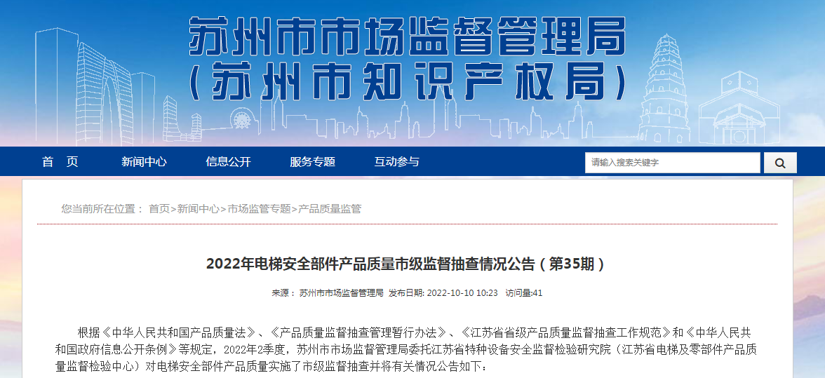 中国质量新闻网讯 10月10日,江苏省苏州市市场监督管理局网站发布2022年电梯安全部件产品质量市级监督抽查情况公告(第35期)。公告称,2022年2季度,苏州市市场监督管理局委托江苏省特种设备安全监督检验研究院(江苏省电梯及零部件产品质量监督检验中心)对电梯安全部件产品质量实施了市级监督抽查。本次共抽查25批次,合格25批次,合格率为100%。