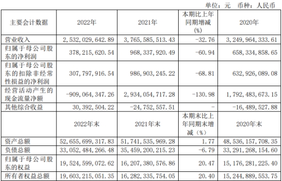 中国经济网北京4月28日讯 华创阳安(600155.SH)于昨日晚间发布2022年年度报告,公司2022年实现营业收入25.32亿元,同比下降32.76%;归属于母公司股东的净利润为3.78亿元,同比下降60.94%;归属于母公司股东的扣除非经常性损益的净利润为3.08亿元,同比下降68.81%;经营活动产生的现金流量净额为-9.09亿元,同比减少130.98%。