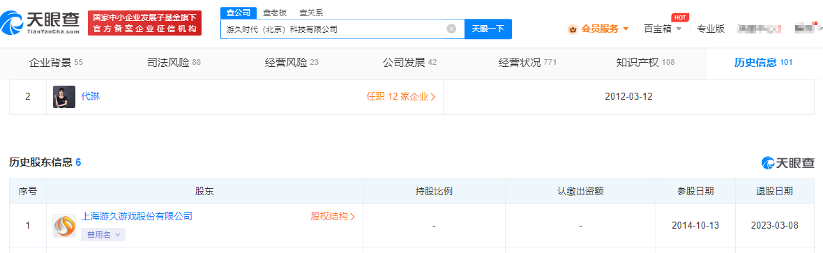 公开资料显示,游久时代(北京)科技有限公司成立于2012年3月,法定代表人为王艳荣,经营范围包括技术开发、电脑动画设计等。天眼查数据显示,今年3月,上海游久游戏股份有限公司退出该公司股东,前者系游久游戏运营主体。