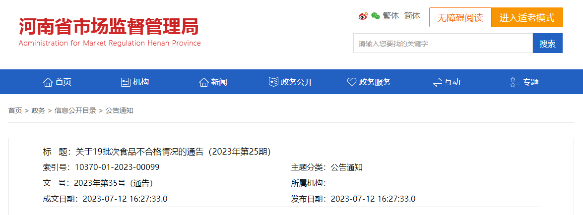 中国质量新闻网讯 7月12日,河南省市场监督管理局网站发布关于19批次食品不合格情况的通告(2023年第25期)。本期抽检了饼干、餐饮食品、炒货食品及坚果制品、调味品、豆制品、糕点、罐头、酒类、肉制品、食糖、食用农产品、薯类和膨化食品、速冻食品、糖果制品、饮料、食品添加剂16大类食品849批次样品,抽样检验项目合格样品830批次,不合格样品19批次。