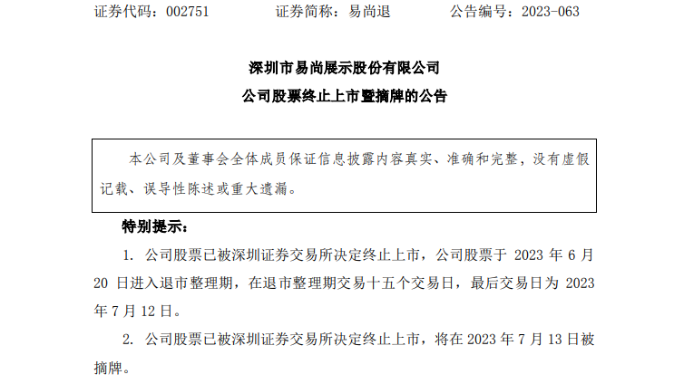 7月12日晚间,易尚退(002751)、文化退(300089)、光一退(300356)、ST美置(000667)发布摘牌公告,其中易尚退、文化退、光一退退市整理期届满,将于7月13日被摘牌;ST美置因触发面值退市,将于7月14日被摘牌。