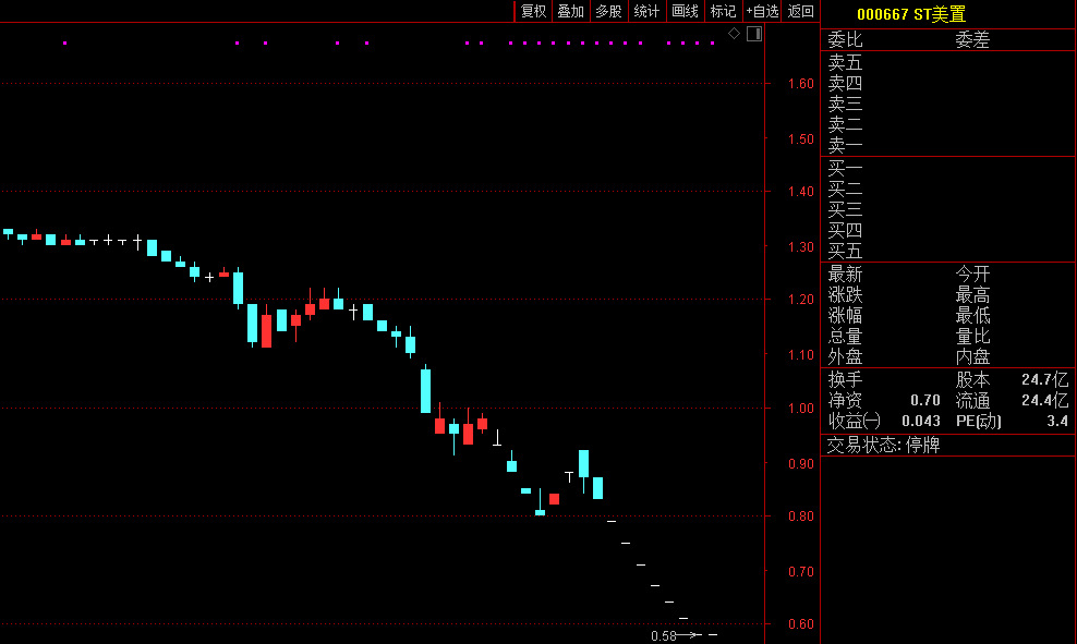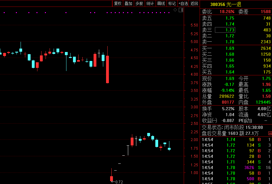 6月20日,光一退进入退市整理期,因不设涨跌幅,当日股价大跌超八成,最低跌至0.72元/股。