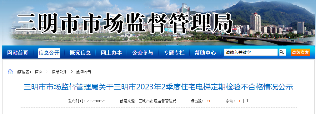 中国质量新闻网讯 9月25日,福建省三明市市场监督管理局网站公示三明市2023年2季度住宅电梯定期检验不合格情况。