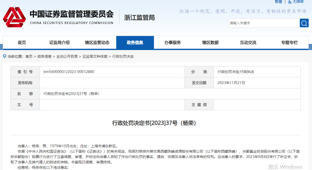 根据浙江证监局日前披露的一份行政处罚决定书,该局对杨荣内幕交易西藏珠峰资源股份有限公司(以下简称西藏珠峰)、宋都基业投资股份有限公司(以下简称宋都股份)股票行为进行了立案调查、审理,并依法向当事人告知了作出行政处罚的事实、理由、依据及当事人依法享有的权利。应当事人的要求,2023年9月8日举行了听证会,听取了当事人及其代理人的陈述和申辩。本案现已调查、审理终结。
