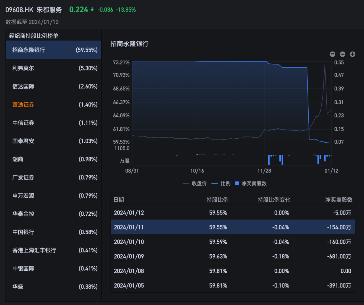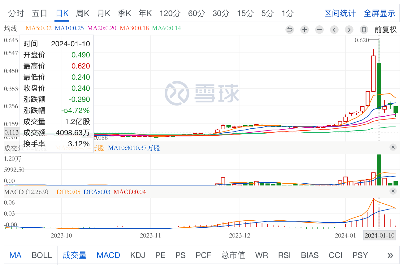连续11个交易日累计涨幅超280%后,1月10日收盘,宋都服务股价跌回0.24港元/股,当日收跌54.72%,巨量成交1.2亿股,成交额4098.63万港元,换手率3.12%。