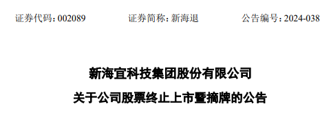 4月17日晚间,新海退公告称,公司股票已被深交所决定终止上市,退市整理期的最后交易日期为4月17日,将于4月18日摘牌。