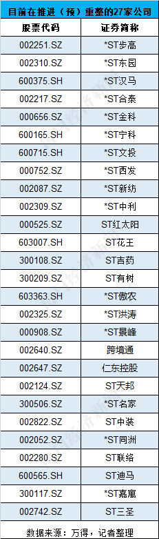 记者梳理发现,截至6月4日,A股市场有27家上市公司在推进(预)重整并发布了相关公告,其中*ST步高(维权)、*ST金科和ST迪马3家公司申请或被申请重整,其余24家公司则申请或被申请预重整。
