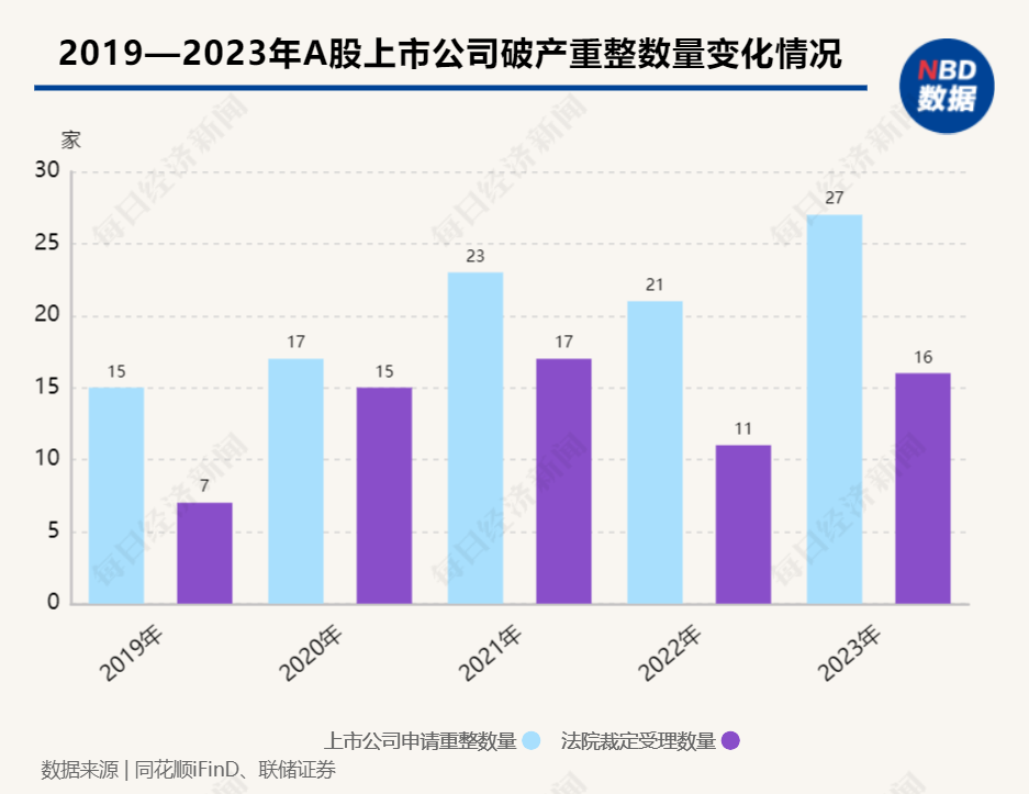 联储证券近期发布的《2023年A股并购市场总结与2024年度展望》披露,2023年A股市场共有27家上市公司向法院申请或被申请重整并发布相关公告,数量成为自2007年我国颁布企业破产法并引进破产重整制度以来的最高值。