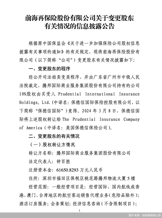 6月4日,前海再保险发布公告称,经公开司法拍卖变卖程序,并由广东省广州市中级人民法院裁定,腾邦国际商业服务集团股份有限公司(以下简称“腾邦国际”)持有的公司10%股权由买受人Prudential International Insurance Holdings,Ltd.(保德信国际保险控股有限公司,以下简称“保德信国际”)竞得。2024年3月8日,保德信国际将上述股权转让给The Prudential Insurance Company of America(美国保德信保险公司)。