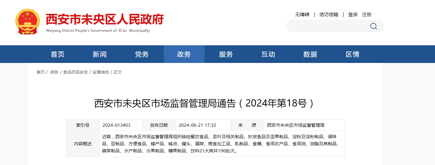 近期,西安市未央区市场监督管理局组织抽检餐饮食品、茶叶及相关制品、炒货食品及坚果制品、淀粉及淀粉制品、调味品、豆制品、方便食品、蜂产品、糕点、罐头、酒类、粮食加工品、乳制品、食糖、食用农产品、食用油、油脂及其制品、蔬菜制品、水产制品、水果制品、糖果制品、饮料21大类共196批次。根据食品安全国家标准检验和判定,抽样检验项目合格样品183批次、不合格13批次,检验项目见附件。