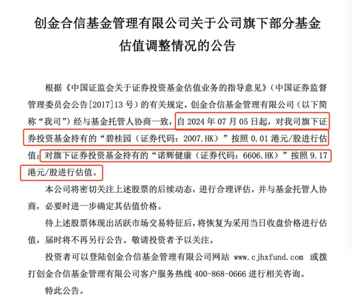 7月6日,创金合信发布公告称,根据证监会关于证券投资基金估值业务的指导意见的有关规定,创金合信经与基金托管人协商一致,自7月5日起,对旗下基金持有的碧桂园按照0.01港元/股进行估值;对旗下证券投资基金持有的诺辉健康按照9.17港元/股进行估值。