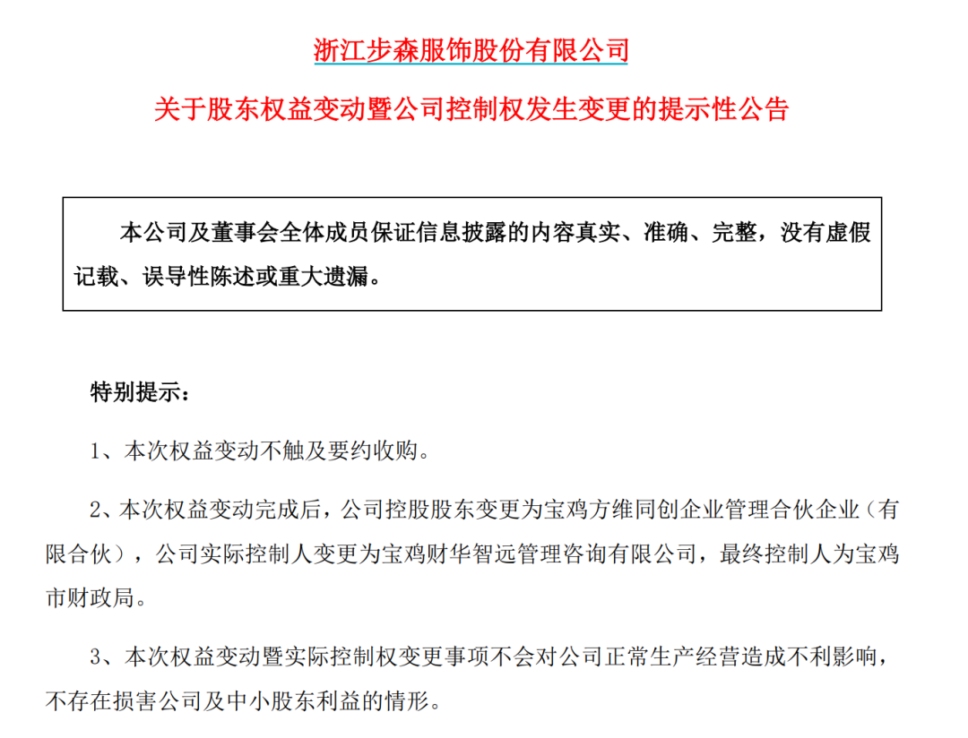 而财华智远则背靠宝鸡市财政局,其新设的有限合伙企业则为方维同创。在6月14日拍卖中,方维同创以最高应价胜出。根据7月8日晚间的公告显示,ST步森控股股东变更为方维同创,实控人变更为财华智远,最终控制人为宝鸡市财政局。