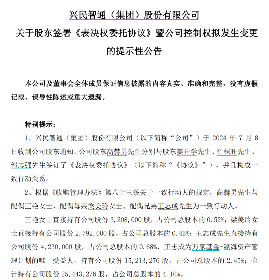 与上述三家公司引入或拟引入国资不同,兴民智通是因实控人被立案,多名股东结成一致行动关系,从而导致公司控股股东及实控人发生变更。