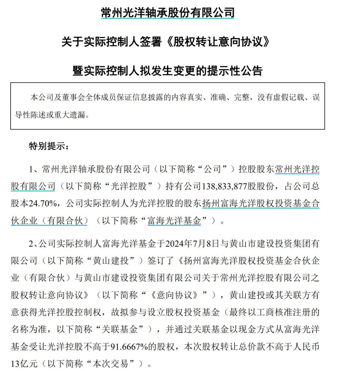 据悉,光洋股份的实控人富海光洋基金与黄山建投签订相关《股权转让意向协议》,黄山建投拟设立关联基金,并通过关联基金受让光洋控股不高于91.67%股权,转让总价款不高于13亿元。