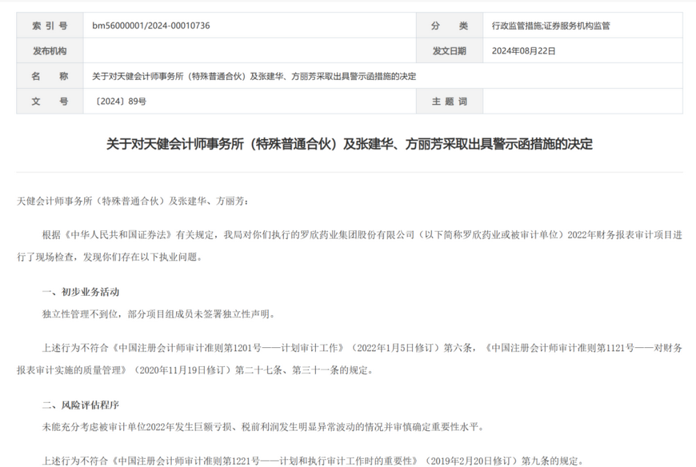 财联社8月30日讯(记者 陈俊兰 赵昕睿)8月29日,山东证监局披露天健会计师事务所的罚单。源于山东证监局在对罗欣药业2022年财务报表审计项目的现场检查中,发现天健会计所在审计过程中存在多项执业问题。