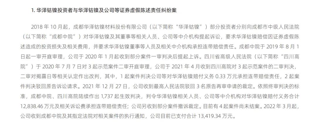 国信证券称,依照终审判决的标准,成都中院、四川高院陆续作出1737起生效判决,判令华泽钴镍相关人员、公司等中介机构对华泽钴镍赔付义务合计1.28亿元及相关诉讼费承担连带赔偿责任。公司另收到部分案件撤诉裁定。目前有4起案件尚未结案。2022年3月起,公司收到成都中院及其指定法院对相关案件的执行通知,公司目前已支付合计1.34亿元。