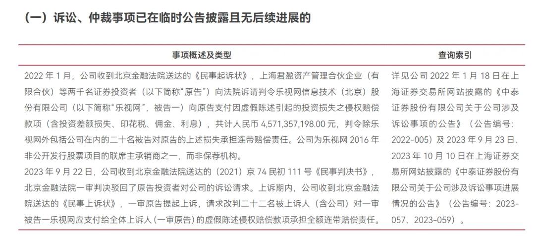 2023年9月22日,公司收到北京金融法院送达的(2021)京74民初111号《民事判决书》,北京金融法院一审判决驳回了原告投资者对公司的诉讼请求。上诉期内,公司收到北京金融法院送达的《民事上诉状》,一审原告提起上诉,请求改判二十二名被上诉人(含公司)对一审被告一乐视网应支付给全体上诉人(一审原告)的虚假陈述侵权赔偿款项承担全额连带赔偿责任。对于这起诉讼事项,中泰证券已在临时公告中披露,且无后续进展。
