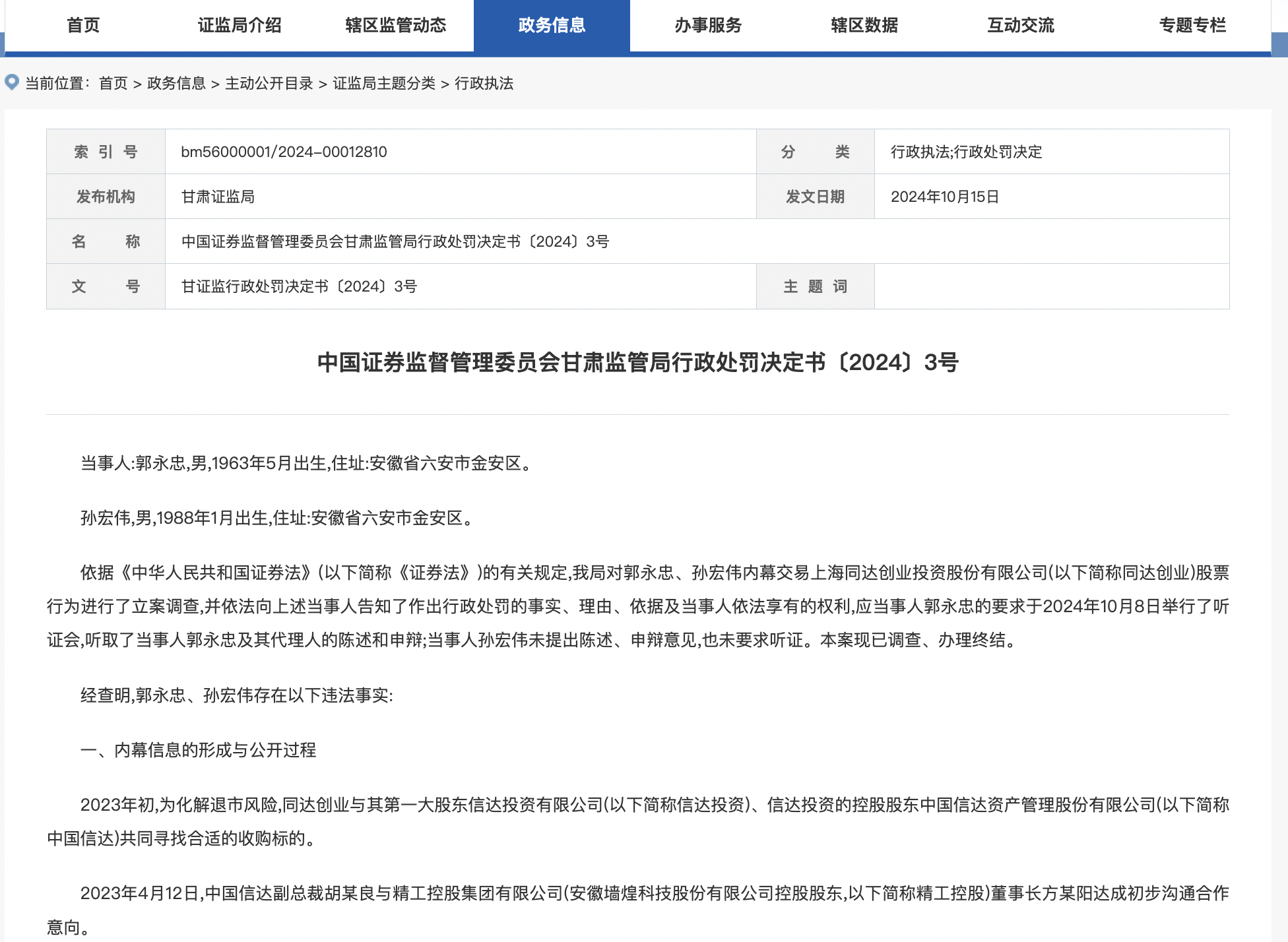 甘肃证监局10月15日披露,针对杨照军、徐华国以及郭永忠、孙宏伟内幕交易同达创业股票一案,现已调查、办理终结。当事人在10月8日听证会上提出的申辩意见,认为该局拟决定的行政处罚过重,请求免于处罚或从轻、减轻处罚。但该局复核后,认为量罚适当,3人所提申辩意见均不予采纳。