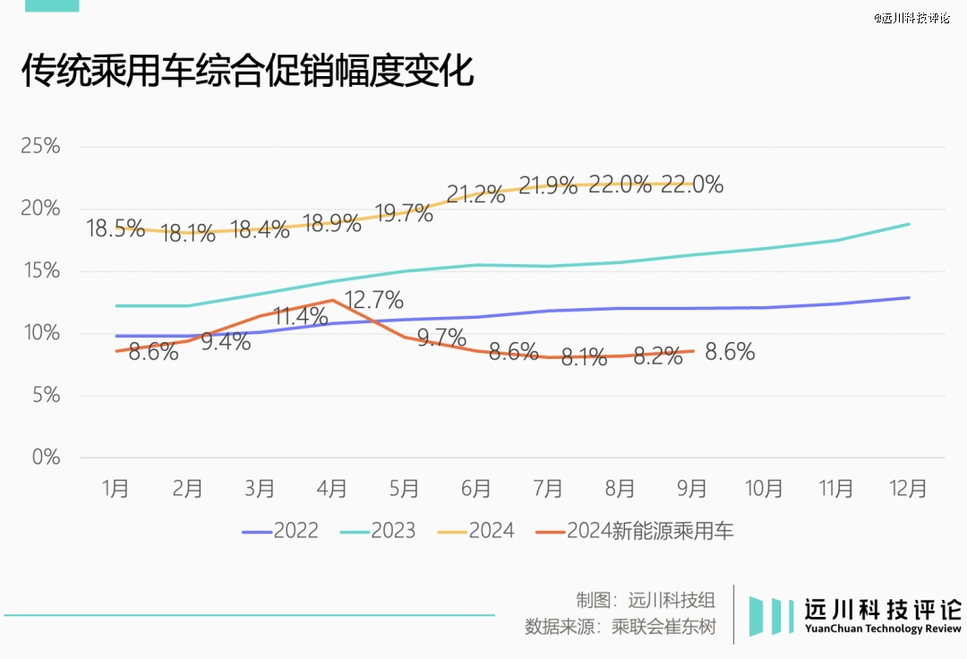 在价格战的强烈攻势下,今年8月新车市场整体折扣率达17.4%,其中新能源汽车为8.2%,燃油车22%,整体打折幅度和体量远超前者。