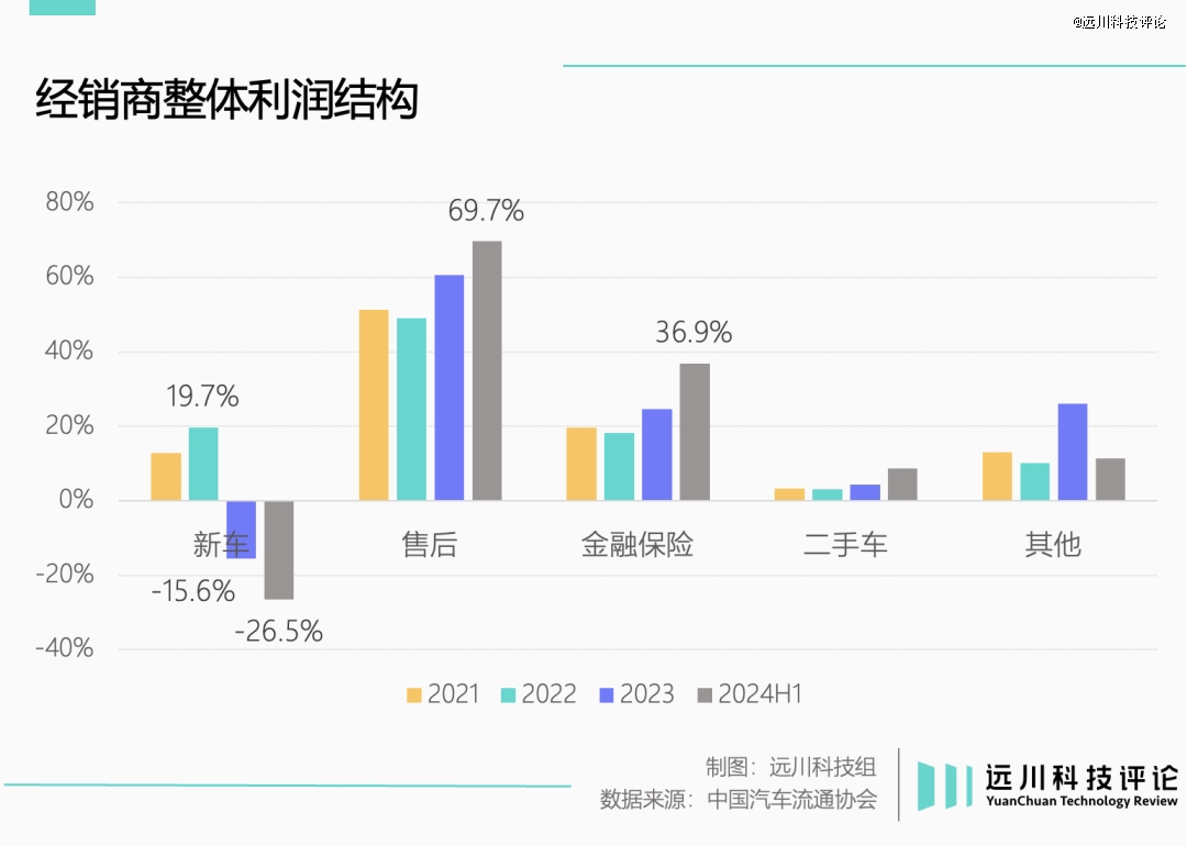 以2022年为例,国内经销商整体利润总和中,新车销售占比19.7%,略高于金融保险,低于售后的49%。2023年后,新车业务的贡献转为负值,足见价格战烈度。