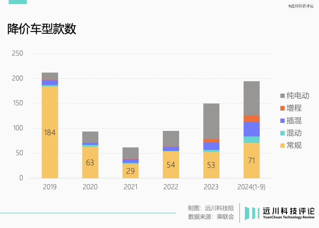 今年一度,新能源车的在新车销售中的渗透率达到53.9%。中金在1月预测,2024年全年渗透率有望增至46%。面对激烈的价格战,经销商狠下决心——今年1-9月,有195款车型降价,燃油车占71款[4]。且整体促销幅度远在新能源汽车之上。