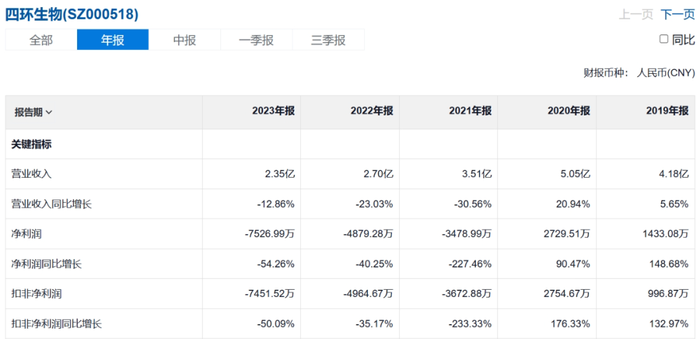 财报显示,四环生物在2021年至2023年的营收分别为3.51亿元、2.7亿元、2.35亿元,同比减少30.56%、23.03%、12.86%;净利润分别亏损3478.99万元、4879.28万元、7526.99万元。