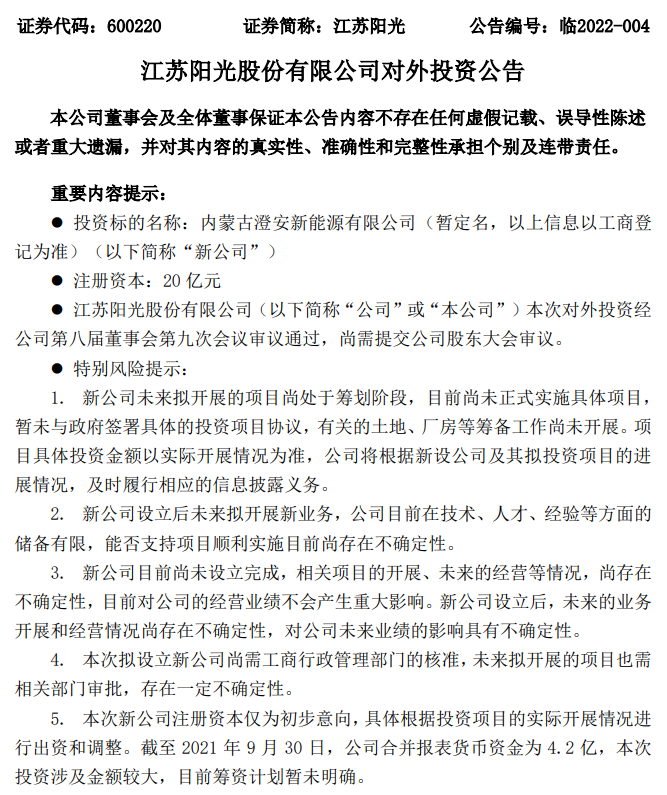 再比如,2022年3月9日,江苏阳光突然公告,拟在内蒙古设立全资子公司内蒙古澄安新能源有限公司,主营光伏业务,注册资本20亿元。公告一出,公司股价在六个交易日收获五个涨停。
