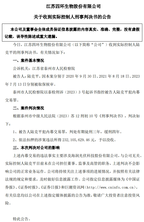 几天前,四环生物(000518.SZ)的一则公告证实了这一消息——实控人陆克平因犯内幕交易罪,被泰州市中级人民法院判处有期徒刑三年,缓刑四年,并没收违法所得约2.32亿元。