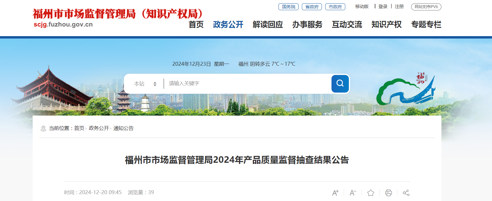 中国质量新闻网讯 近日,福州市市场监督管理局公布2024年产品质量监督抽查结果。