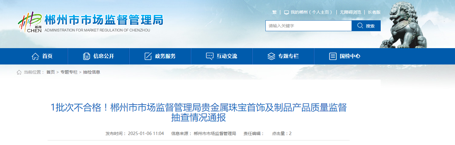 1批次不合格!郴州市市场监督管理局贵金属珠宝首饰及制品产品质量监督抽查情况通报