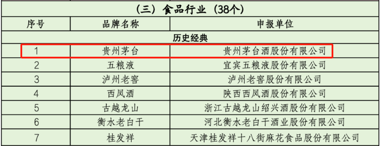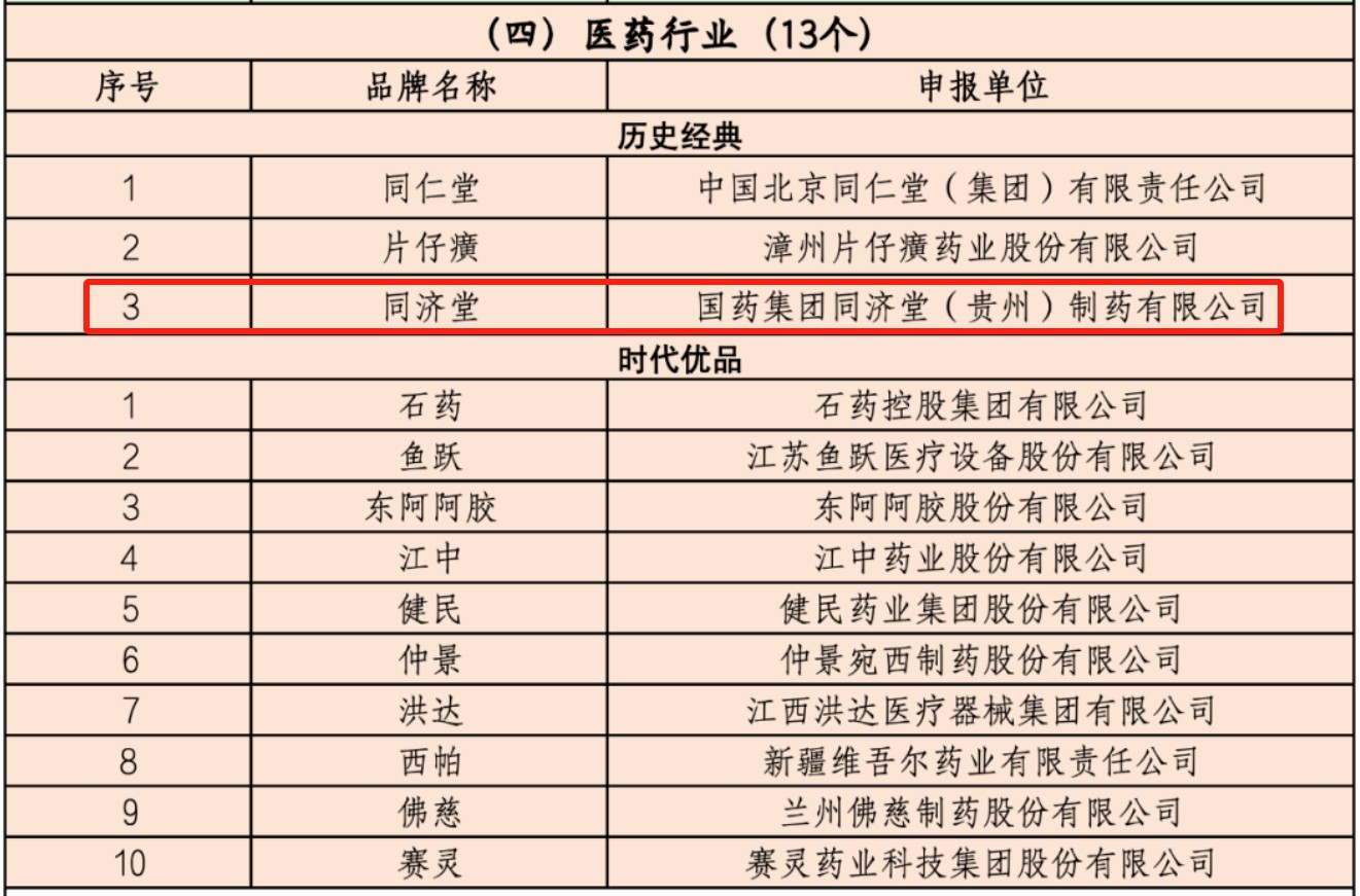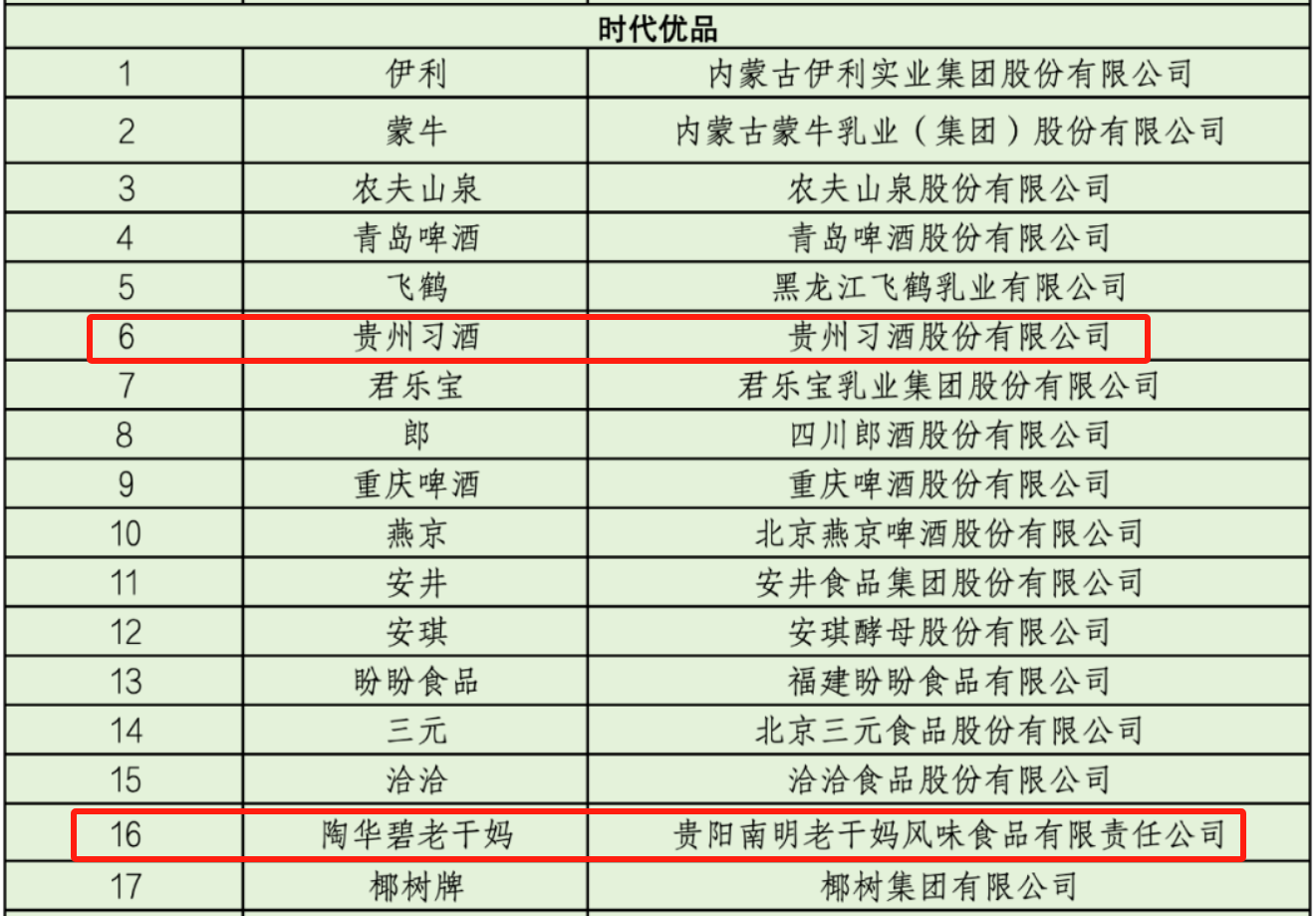 此次公示的首批中国消费名品名单显示,在食品行业中,由贵州茅台酒股份有限公司申报的贵州茅台、贵州习酒股份有限公司申报的贵州习酒、贵阳南明老干妈风味食品有限责任公司申报的陶华碧老干妈,共3个品牌入选;在医药行业,由国药集团同济堂(贵州)制药有限公司申报的同济堂入选;在区域品牌,由遵义市人民政府、毕节市人民政府申报的“赤水河谷中国酱香”入选。