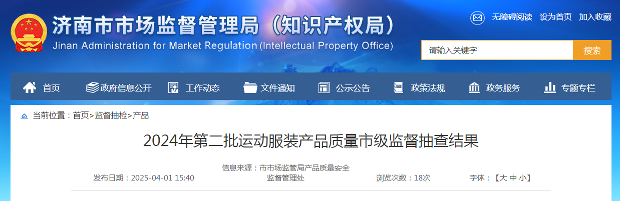 中国质量新闻网讯 近日,济南市市场监督管理局公布2024年第二批运动服装产品质量市级监督抽查结果。2024年第二批重点工业产品质量市级监督抽查共抽查流通领域运动服装产品11批次。