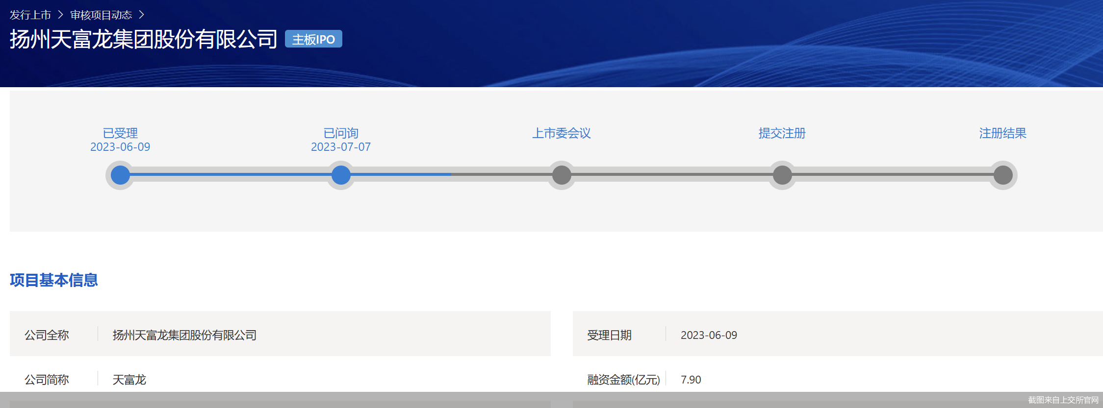 据了解,天富龙以差别化涤纶短纤维的研发、生产和销售为主营业务,产品布局由再生有色涤纶短纤维,拓展至差别化复合纤维及聚酯新材料,覆盖以“人”为核心的商务、出行、家居、健康护理、衣着等场景。公司沪市主板IPO于2023年6月9日获得受理,当年7月7日进入问询阶段。