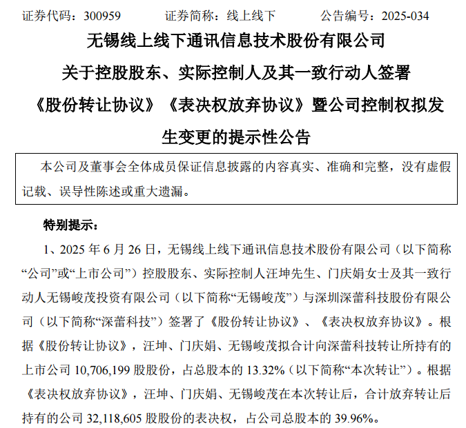 线上线下(300959)6月27日公告称,公司控股股东、实控人拟向深蕾科技转让合计13.32%的股份,并放弃后续近40%的表决权。交易完成后,深蕾科技将入主公司,夏军、李蔚将成为新实控人。公司主营业务为移动信息服务和数字营销,与抖音、腾讯等顶级媒体平台有稳定合作。公告显示,公司一季度已实现扭亏为盈,且股东户数近期有所下降,显示出筹码的集中。6月以来,该股股价已大涨超16%,总市值达36.33亿元。此次控制权变更,被市场视为可能带来新的战略方向或协同效应。