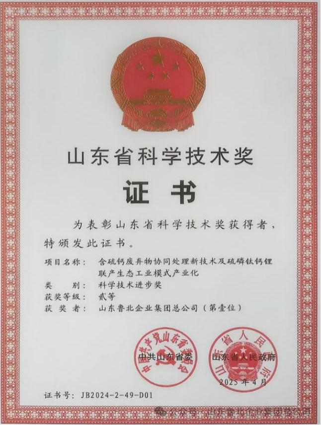 6月27日,山东省科技大会在济南召开。山东鲁北企业集团总公司、山东鲁北化工股份有限公司、山东鲁北化工建材设计院、山东金海钛业资源科技有限公司等共同完成的“含硫钙废弃物协同处理新技术及硫磷钛钙锂联产生态工业模式产业化”项目荣获2024年度山东省科学技术进步奖二等奖。