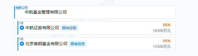 中航基金实控人为中航工业集团,中航证券出资1.65亿元,持股55%,为第一大股东;北京首钢基金出资1.35亿元,持股45%,为第二大股东。