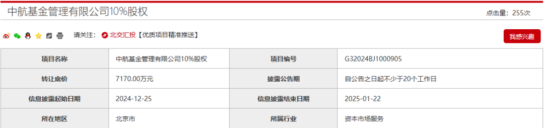 2024年12月25日,北京产权交易所显示,中航基金10%股权挂牌转让,转让方为中航基金大股东中航证券,转让底价为7170万元,对比所有者权益,溢价超90%。