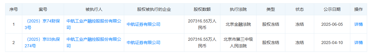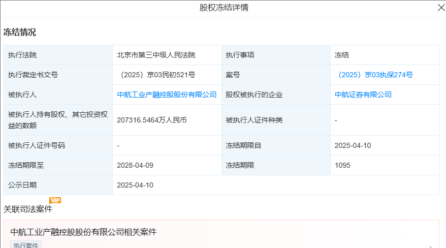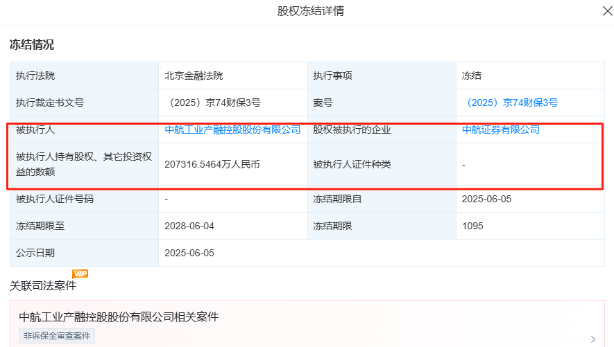 天眼查显示,中航产融持有的中航证券28.29%股权、对应金额20.73亿元先后被两次司法冻结,冻结期限均为三年。