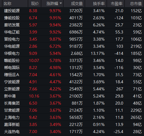 电力股集体走高,建投能源、豫能控股、廊坊发展、华电辽能等多股涨停。