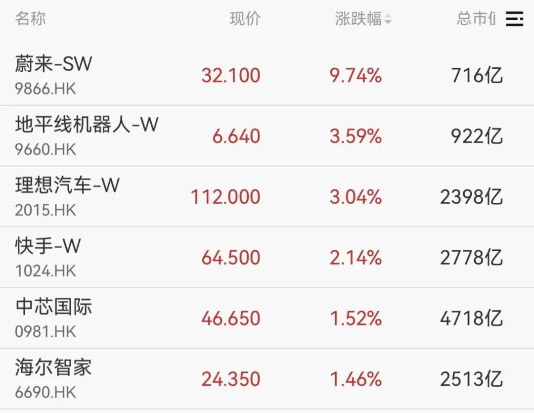 港股方面,三大指数均小幅上涨,蔚来涨超9%,理想汽车、快手、中芯国际等跟涨。
