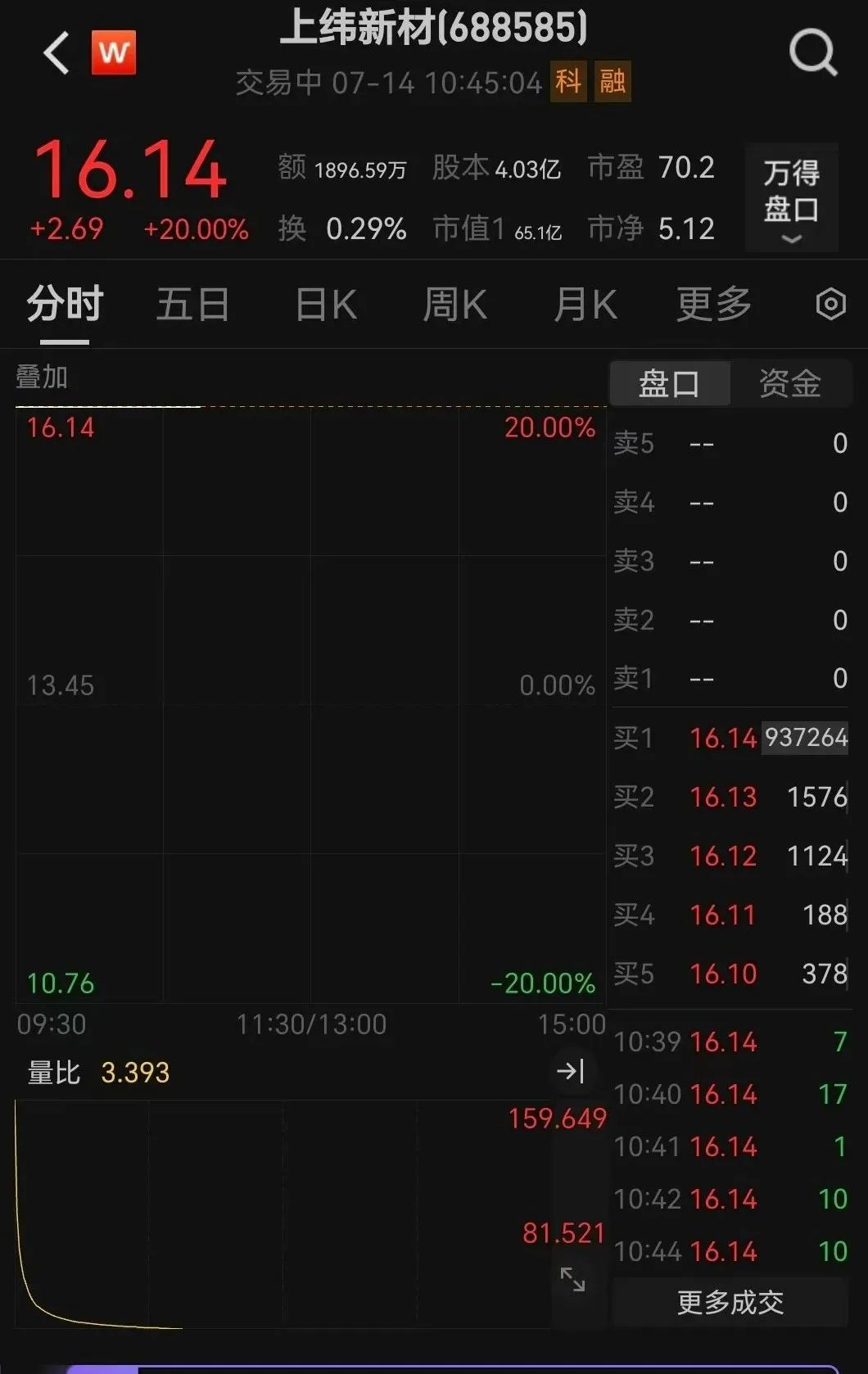 强势股方面,上纬新材开盘1秒钟直接封上涨停板,涨幅达20%。截至发稿,买一封单超93万手。截至今日早盘,上纬新材连续四日20%涨停。